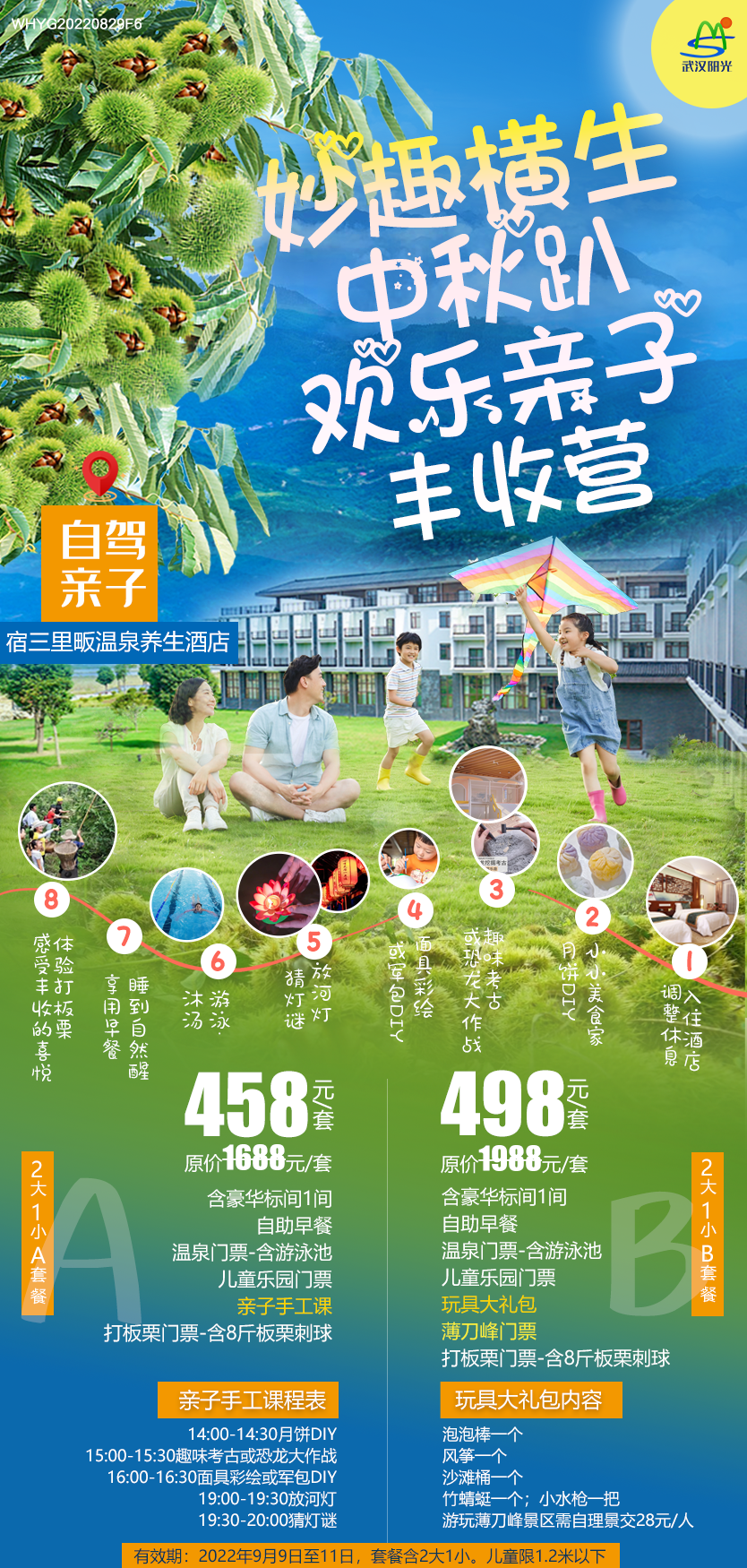 约起亲朋好友来一场说走就走的探索之旅。追风逐云、山涧的风、罗田的中秋气息......尽情撒欢儿吧!漫步在山涧云海中,踏足在酒店温泉里,享亲子DIY月饼、放河灯、 猜灯谜,体验打板栗,感受丰收的喜悦,简直太舒服啦!