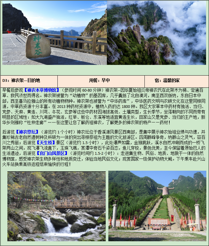 用 餐:神农架当地2早3正餐(不占床不含早),特别安排长桌宴或者百草宴(不提前指定),不用餐者不退费